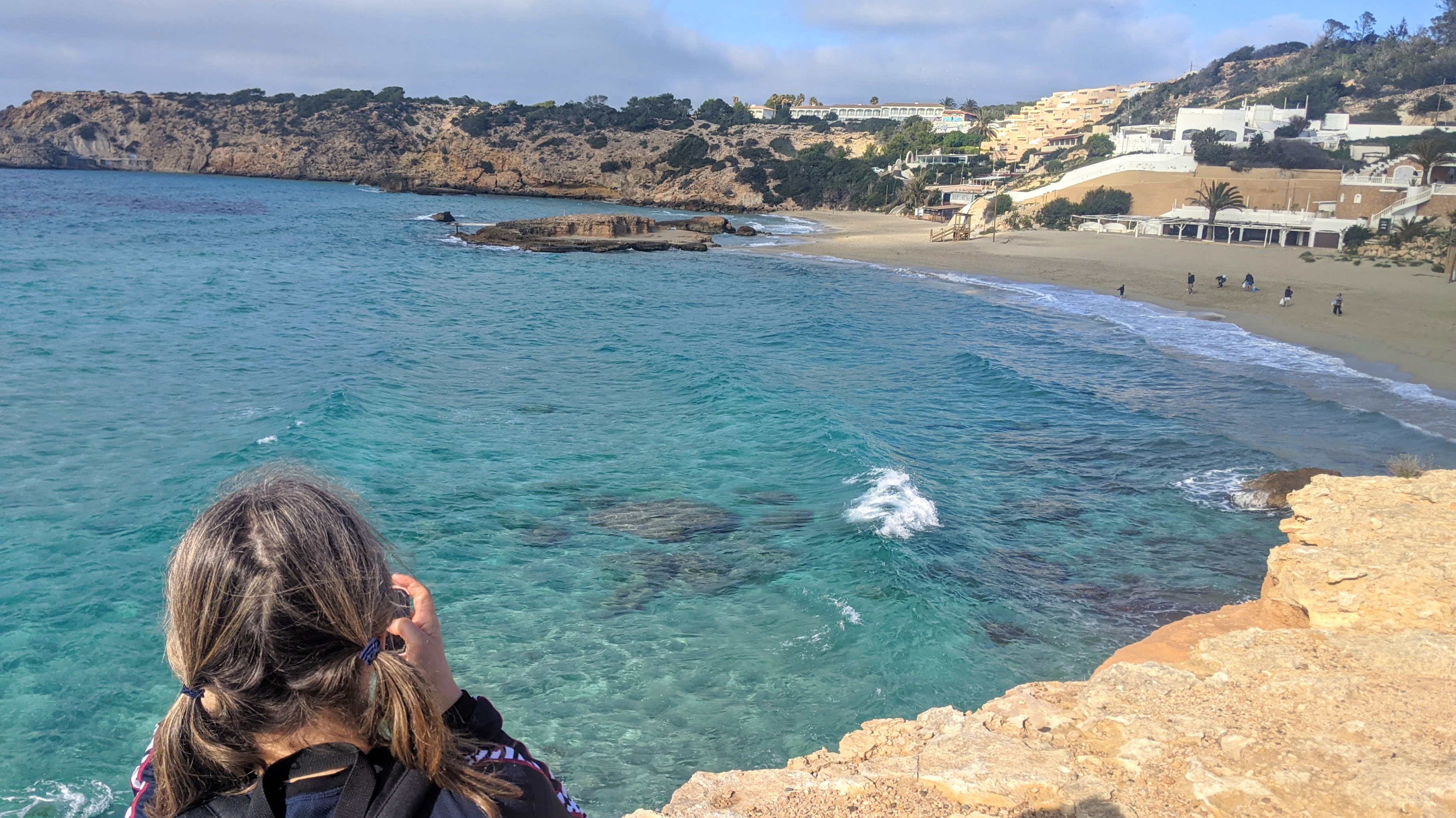 We had lunch overlooking Cala Tarida, a rather urban beach but offering a fantastic combination of fine sand and turquoise blue waters. Then came a fascinating walk connecting Tarida and Corral, on a high cliff, past luxurious villas, and with some navigation issues – well, basically we ended up on the private property side of a fence, and struggled to find our way back to the public road!