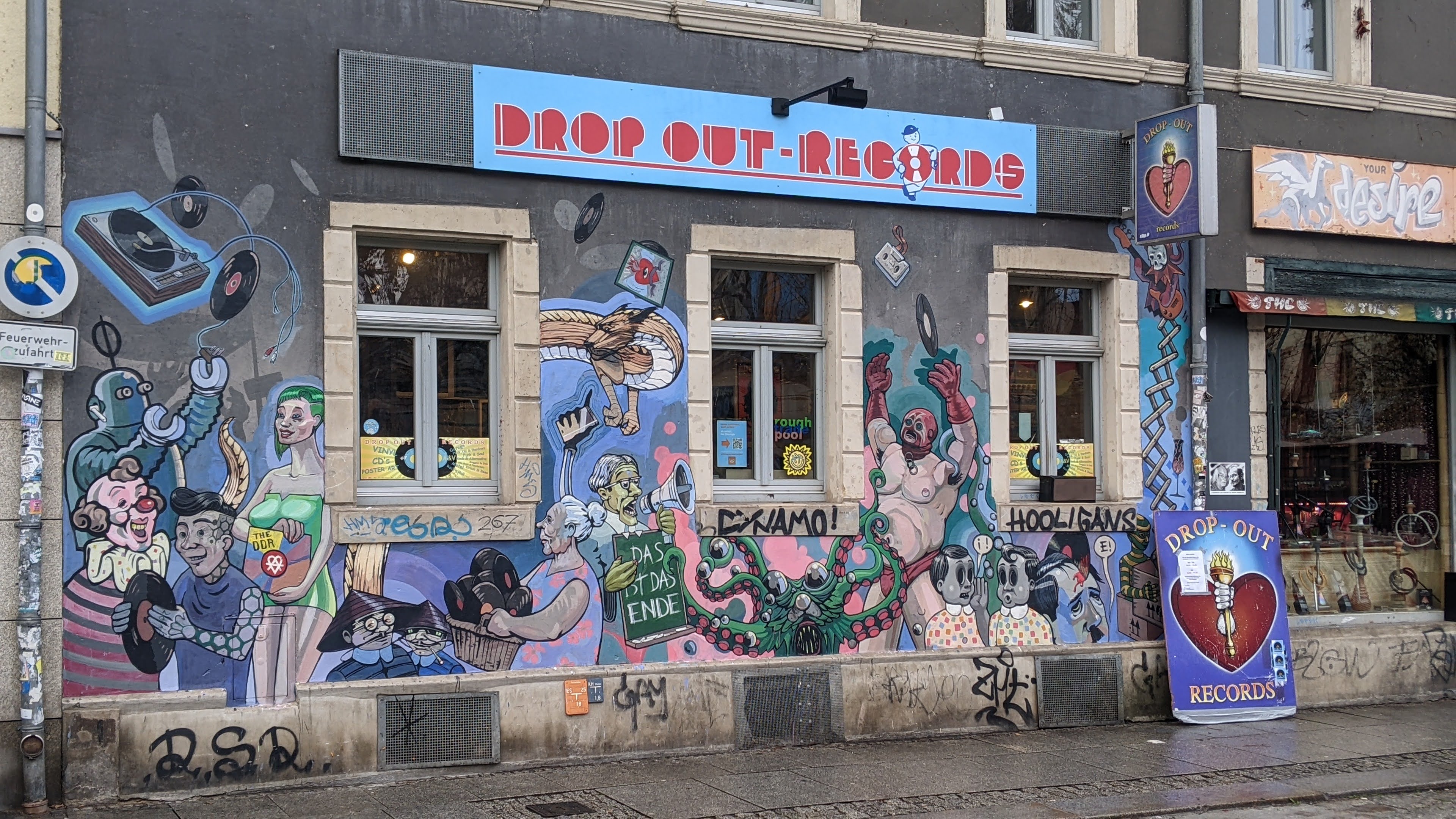 Luckily, by the time we left the rain had stopped and there was a hint of sunshine. Better still, turns out that we had actually hit a cool neighborhood full of trendy cafés and street art. We spent some time in a record shop. They had all sorts of great vinyl and, surprisingly, an album by Spanish 70’s progressive band, Asfalto. So it goes.