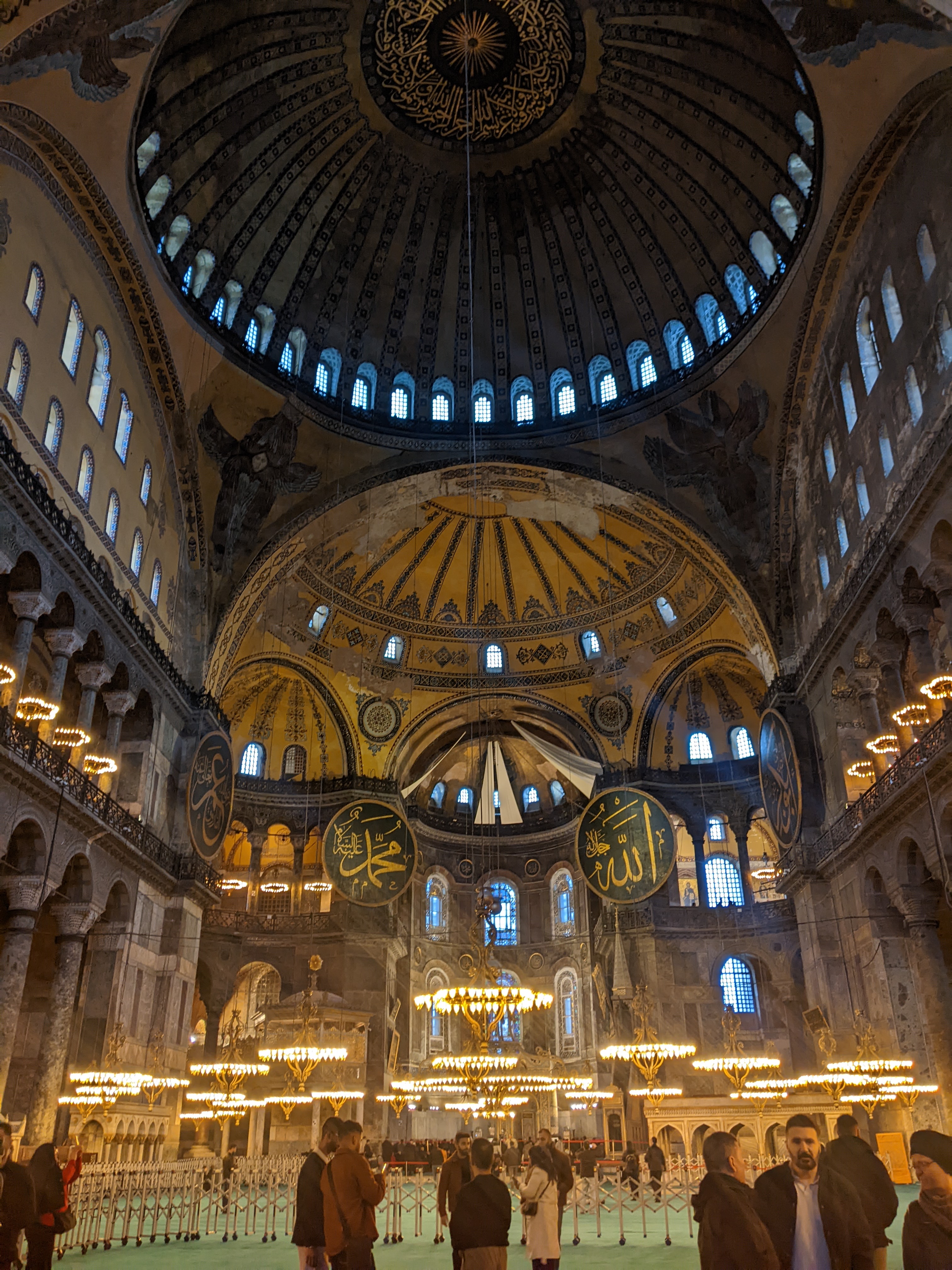 Two. Entering Hagia Sophia together with the Muslim faithful. No, it was not just about saving 25 euro per person, the tourist fee to access the mosque starting 2024. We had been given the tip to enter the temple as muslims, and gesture “we want to pray” if we asked. It wasn’t even necessary. The sky opened above our heads and the downpour sped up all checks as we all ran for cover. Once inside, we walked respectfully, taking in the beauty while feeling the soggy clothing on us. It was moving. Constantinople, Bizantium…history.