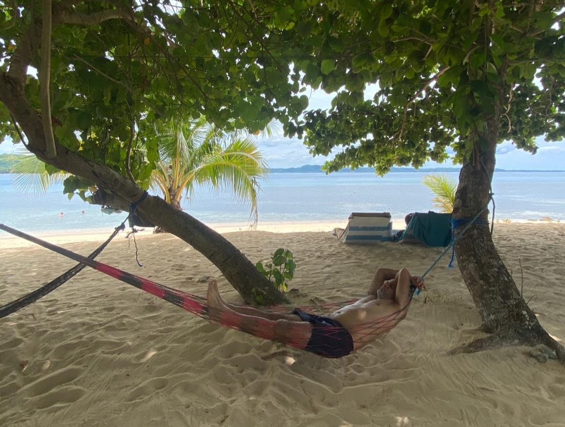 I had read so much about tri island that it was almost a matter of scientific interest to compare expectations to reality. Naked was meant for a short stop, ideally before sunset, and I already told you how it worked for us. Daku, the largest, was supposed to be uninteresting, but we had a glorious afternoon swim. And by the time we got to Guyam, most people’s favourite, we were so tired of swimming and snorkeling that we just sat down at a restaurant shack and enjoyed a cold one and their famous Guyam burger.